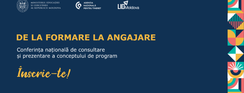Înscrie-te și participă la Conferința națională de consultare și prezentare a conceptului programului național pentru tineret „De la formare la angajare”, un eveniment dedicat dialogului deschis dintre tineri, organizații, centre de tineret și instituții publice implicate în elaborarea politicilor de tineret din Republica Moldova.