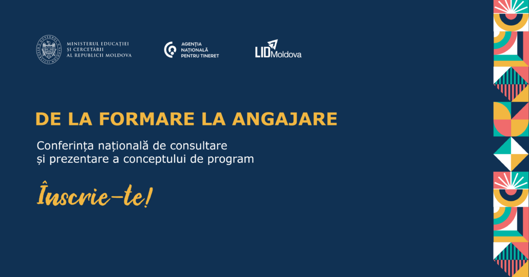 Înscrie-te și participă la Conferința națională de consultare și prezentare a conceptului programului național pentru tineret „De la formare la angajare”, un eveniment dedicat dialogului deschis dintre tineri, organizații, centre de tineret și instituții publice implicate în elaborarea politicilor de tineret din Republica Moldova.